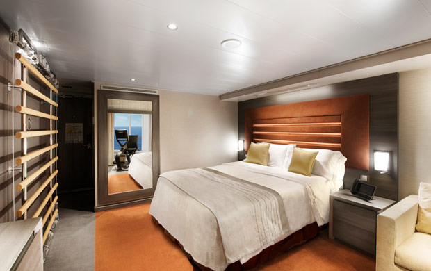 Two-deck-high stateroom. On main level, open living/dining room with sofa that converts to double bed. On second level, master bedroom with a queen bed which can be converted into two single beds (on request).
